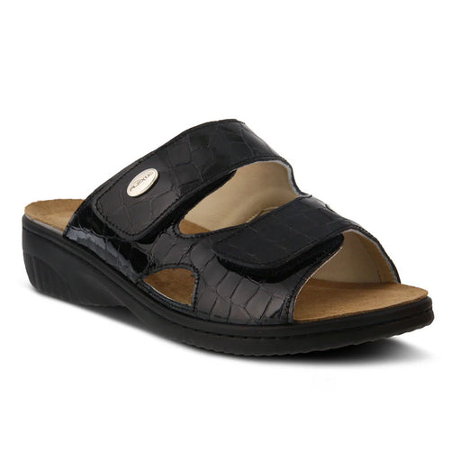 SPRING FOOTWEARGo wild! These patent leather slides have an exotic crocodile inspired embossed design. The double Velcro straps give you adjustability and the rem...
