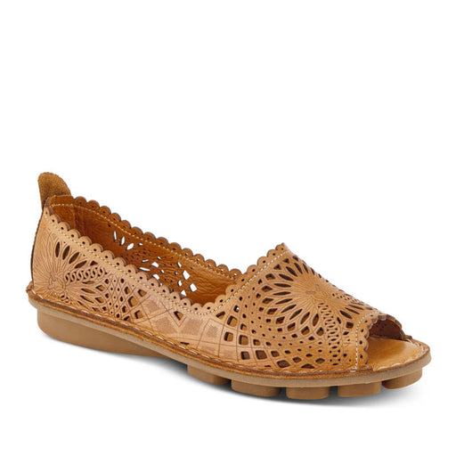 SPRING FOOTWEAREuropean inspired premium leather slingback sandal featuring geometric laser cutout and etching design with a dainty scalloped top line detail. He...