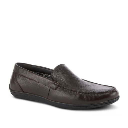 SPRING FOOTWEARFashionable men's driving moccasin style slip on shoe in full grain soft milled leather featuring a hand stitched moccasin style apron, a comforta...