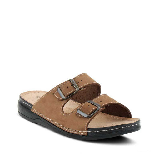 SPRING FOOTWEARA stitch to sole construction nubuck leather slide sandal with dual buckle straps for adjustability and fit. The leather covered padded footbed add...