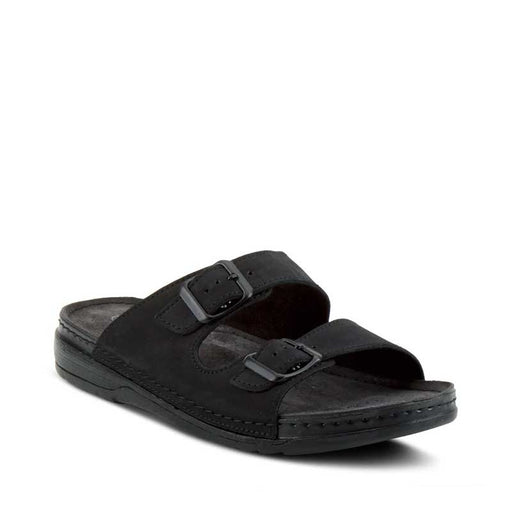 SPRING FOOTWEARA stitch to sole construction nubuck leather slide sandal with dual buckle straps for adjustability and fit. The leather covered padded footbed add...