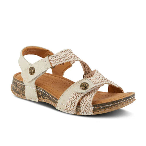 SPRING FOOTWEARThis corked sandal has a double hook and loop paired with an antiqued metal embossed button on the straps. These braided crossed straps gives a vin...