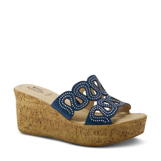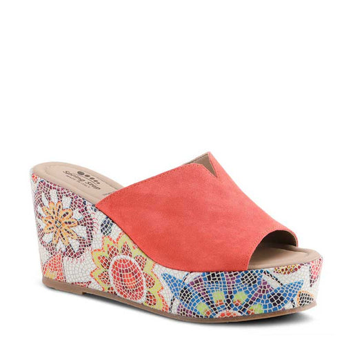 SPRING FOOTWEARItalian-inspired trendy one-piece slide sandal featuring genuine suede upper with a "V" central cut detail and flower print wrapped comfortable wed...