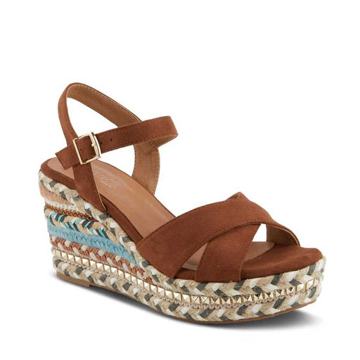 SPRING FOOTWEARBeautifully woven, patterned espadrille platform sandal wedge adorned by pyramid studs; features a criss cross front strap and an adjustable buckle...