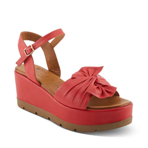 SPRING FOOTWEARElevate your style with our leather wedge sandal, featuring a convenient hook and loop closure, an intricately twisted/gathered leather flower deta...