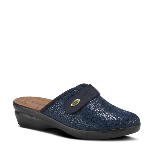 SPRING FOOTWEAREasy to slip-on indoor clog style slipper with adjustable strap. Heel Height (approximately): 1 3/4" Features: Round toe, synthetic textured sue...
