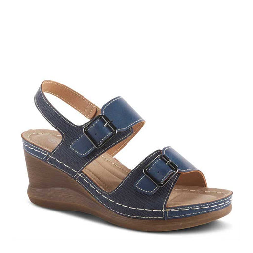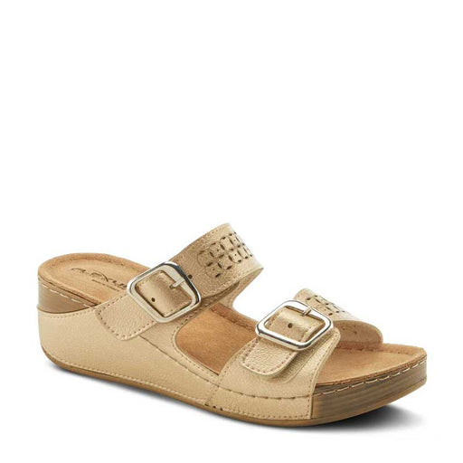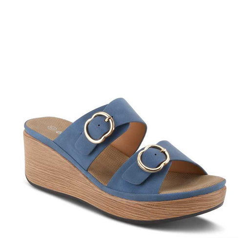SPRING FOOTWEARChic platform wedged slip on sandal with double rounded buckles and straps on a padded insole to secure your foot and ensure long lasting comfort a...